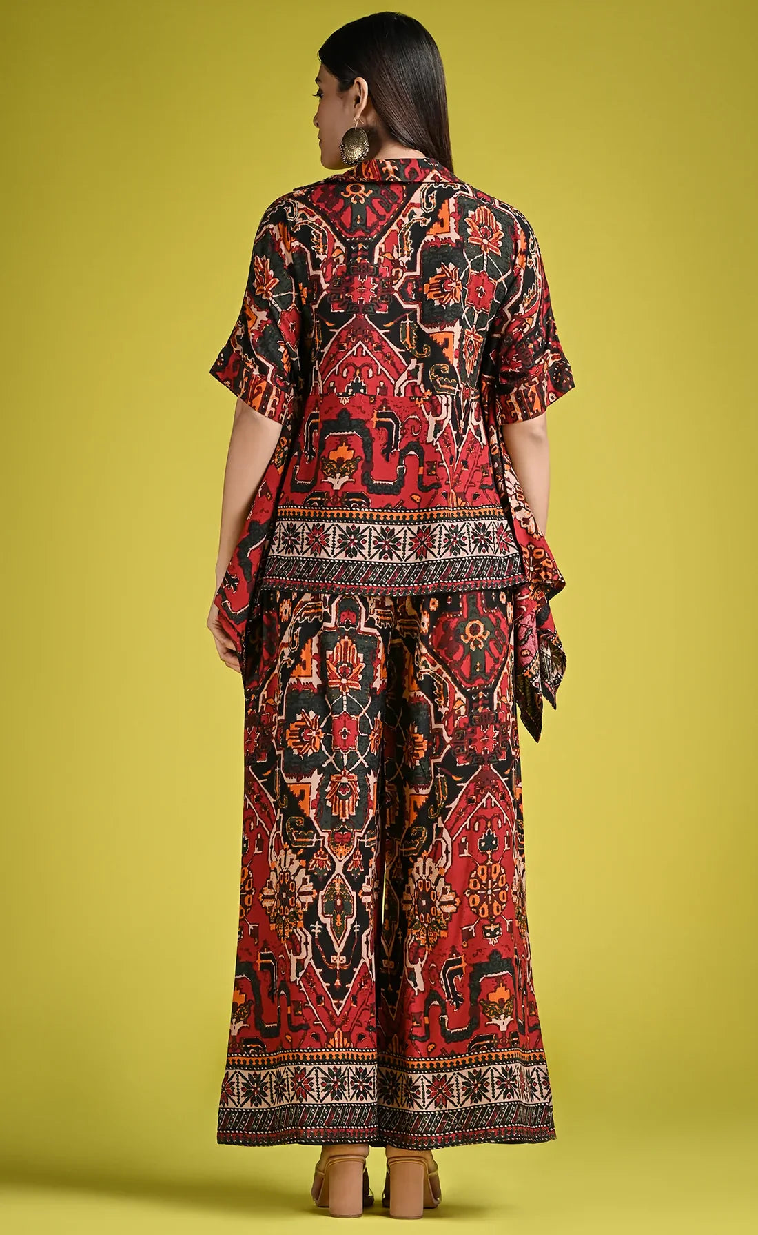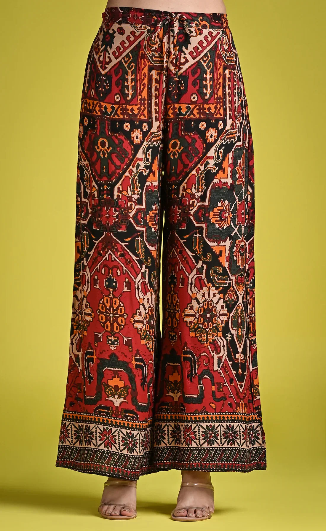 Conclusion: Indulge in the artistry of ajrak prints with this stunning rayon palazzo set, where tradition meets contemporary style. Embrace comfort without compromising on sophistication, and make a statement with every step in this meticulously crafted ensemble. Perfect for embracing cultural heritage while exuding modern elegance, this palazzo set promises to be a cherished addition to your wardrobe.