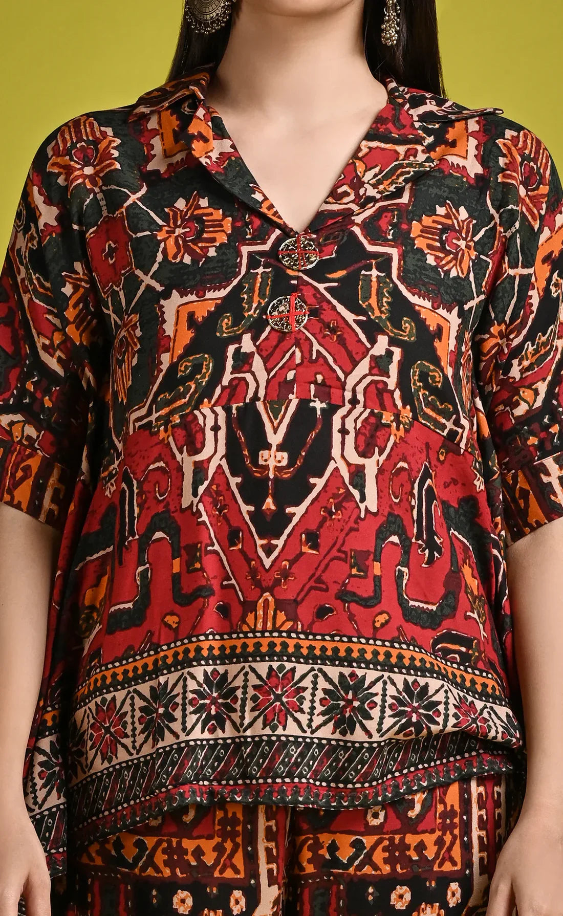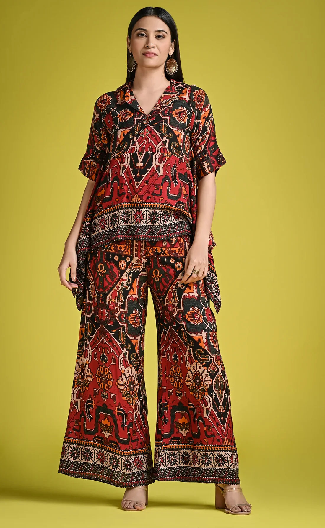 Elevate your wardrobe with this exquisite rayon palazzo set, featuring alluring ajrak prints that embody timeless beauty and cultural heritage. This ensemble comprises a loose-fitted crop top and matching palazzo pants, meticulously crafted to blend comfort with striking design.