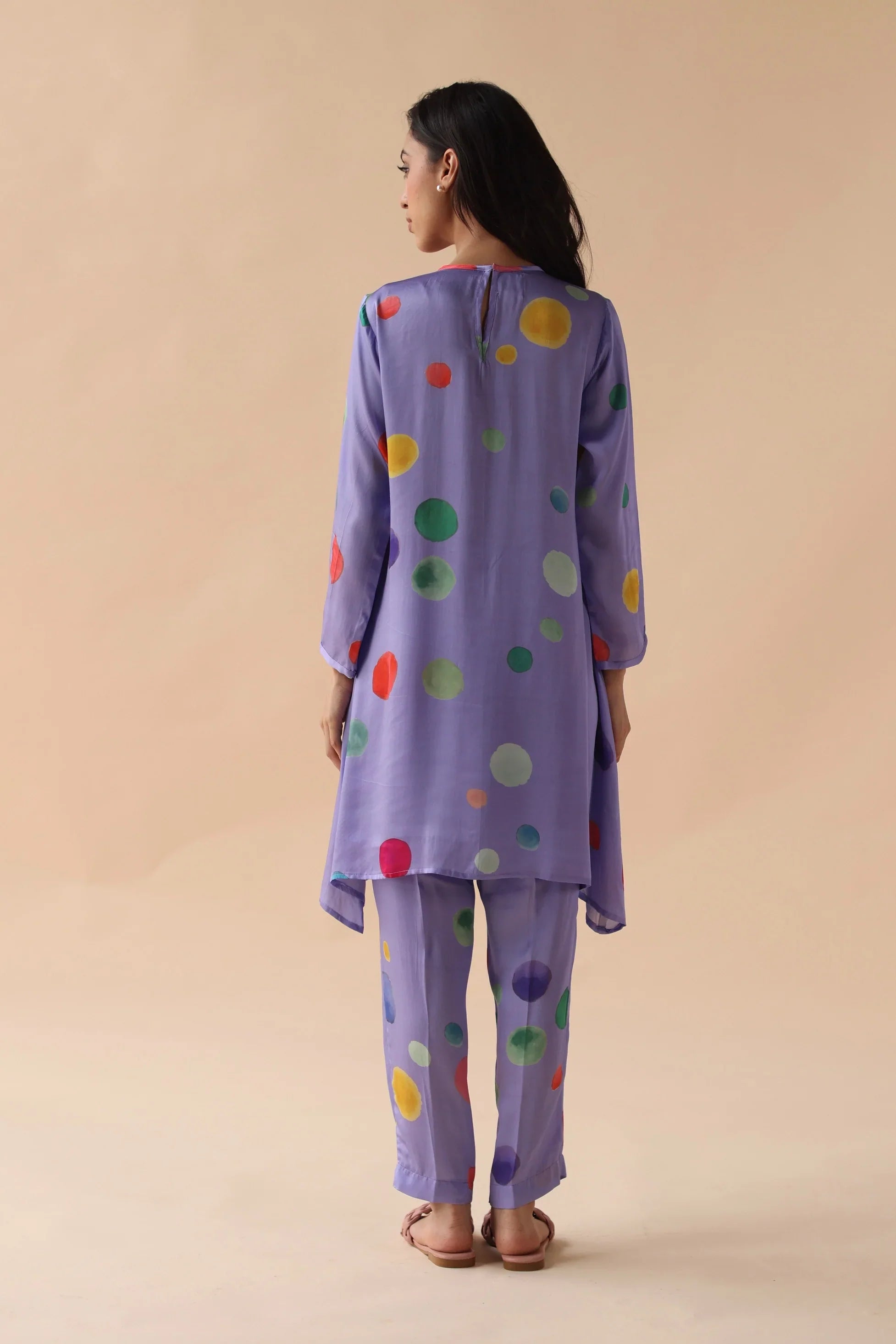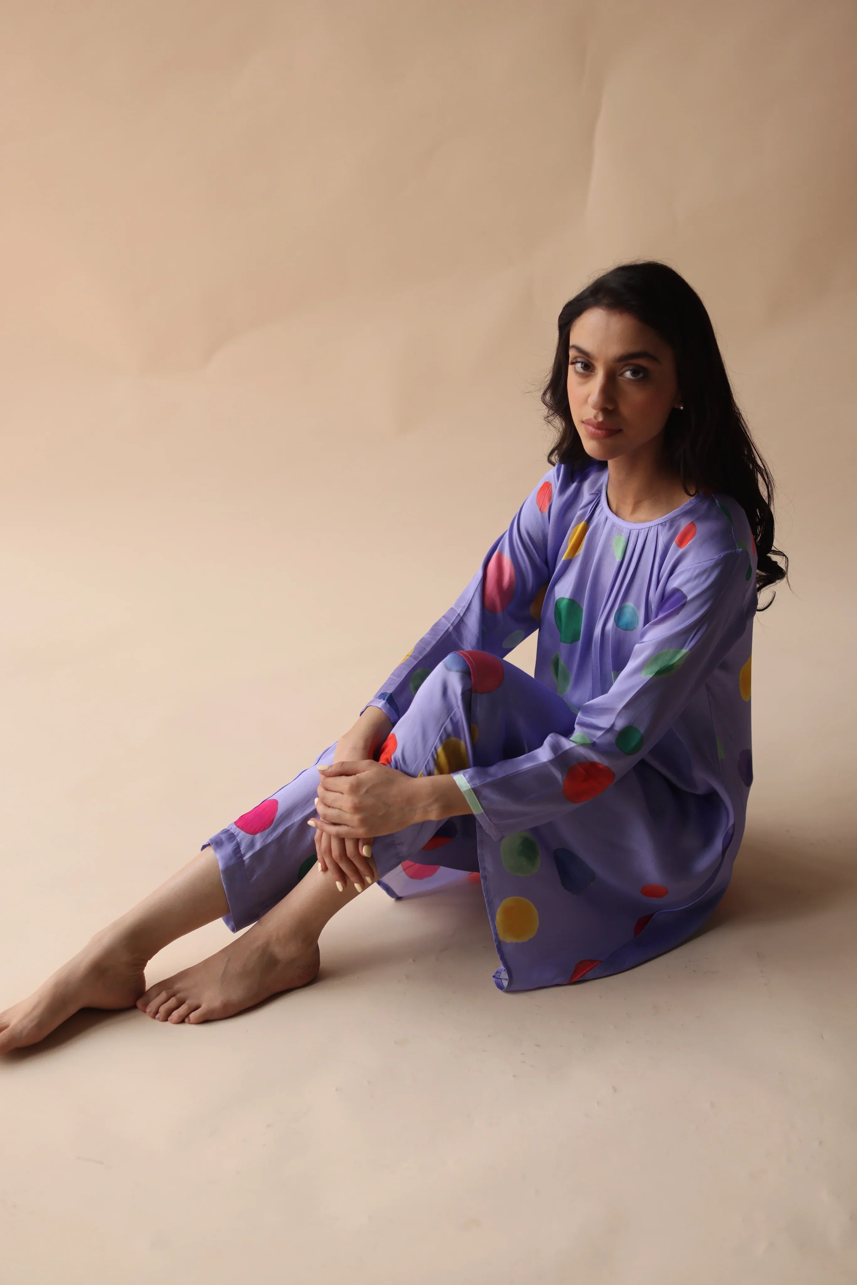 The Clothji Co-ord set exudes elegance and sophistication, marrying timeless design with contemporary flair. Crafted with meticulous attention to detail, this ensemble features a charming polka dot Digital print that dances gracefully across the finest satin silk fabric, lending it an ethereal quality that is both luxurious and lightweight.