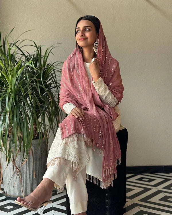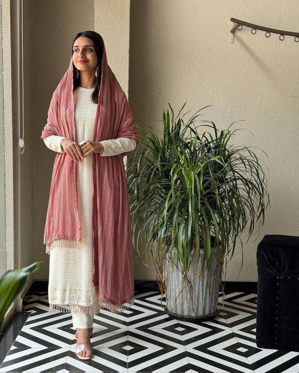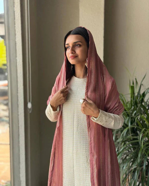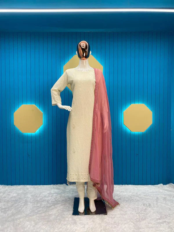 The kurta and pant are crafted from faux georgette fabric, known for its lightweight and flowy texture, ideal for comfort and elegance. Both pieces feature intricate sequence thread embroidery work, adding a touch of sophistication and charm. The inner lining of the kurta is made from silk, ensuring a smooth and luxurious feel against the skin.