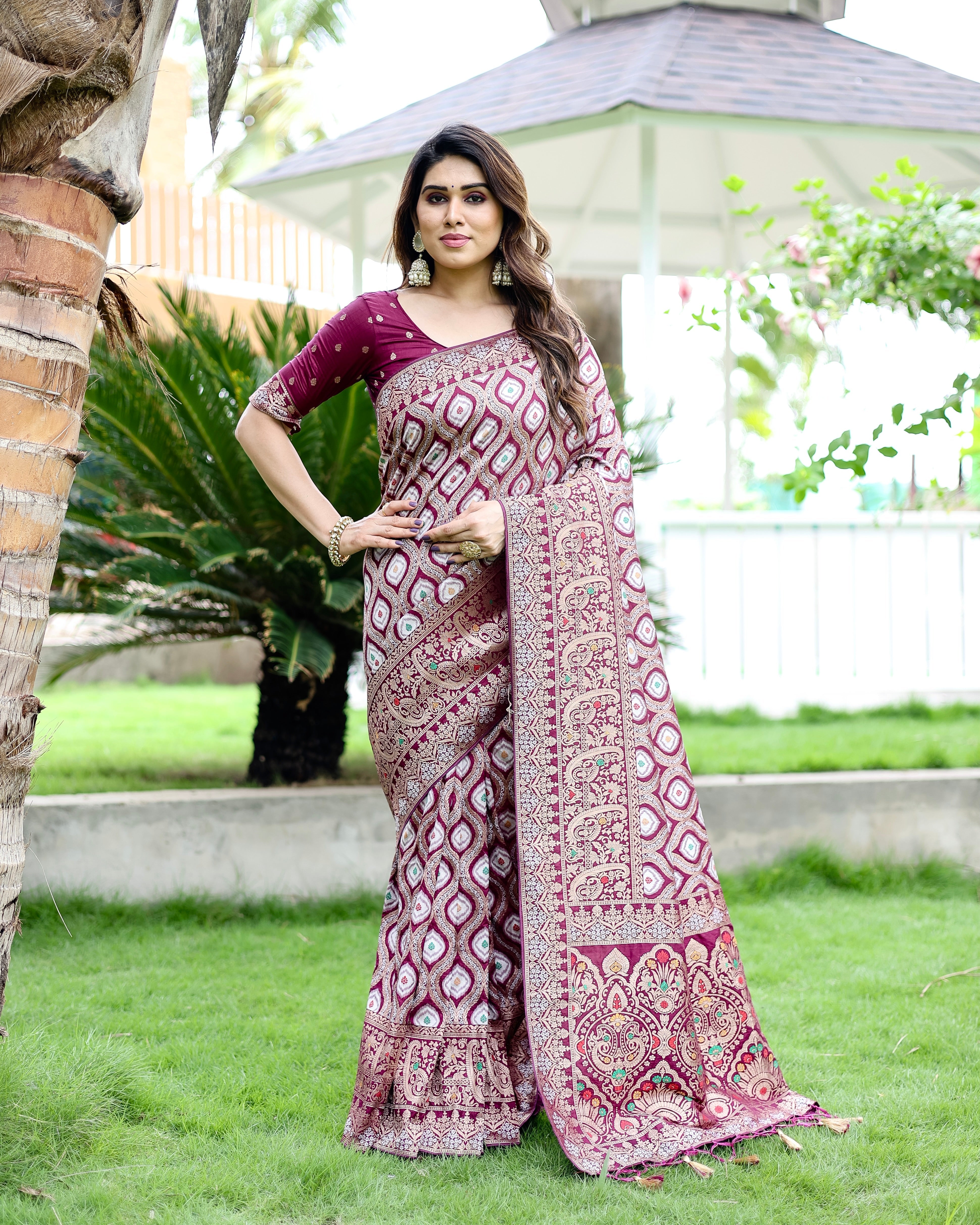 Wine Kanjivaram pattu With Beautiful Zari weaved Saree